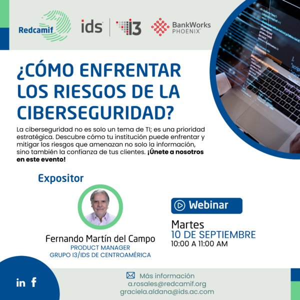 El Webinar “Cómo enfrentar los riesgos de la Ciberseguridad” fue organizado por la Red Centroamericana y del Caribe de Microfinanzas, REDCAMIF y Grupo IDS, facilitador tecnológico, con amplia experiencia en el sector financiero.